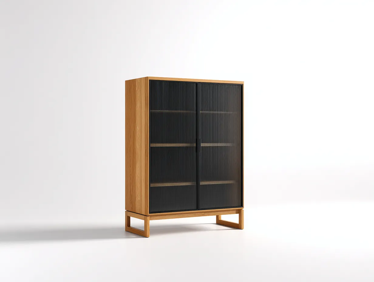 Le meuble est fabriqué en bois avec une finition chêne clair mettant en avant le veinage naturel de la surface. Les 2 portes sont dotées de panneaux en verre nervuré noir, qui filtrent légèrement le contenu tout en conservant une lecture visuelle raffinée. La base ouverte en bois reprend la teinte du corps du meuble et contribue à une silhouette légère et équilibrée.