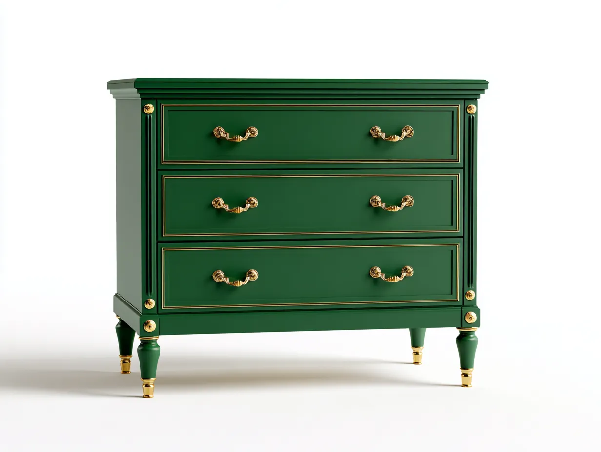 La structure est réalisée en bois avec une finition vert foncé mate qui met en valeur les moulures du meuble. Les poignées, les éléments décoratifs d angle et les embouts de pieds en ton doré créent un contraste lumineux et soulignent la qualité visuelle de l ensemble. Les tiroirs sont conçus pour un usage quotidien et la base assure une bonne stabilité dans la chambre.