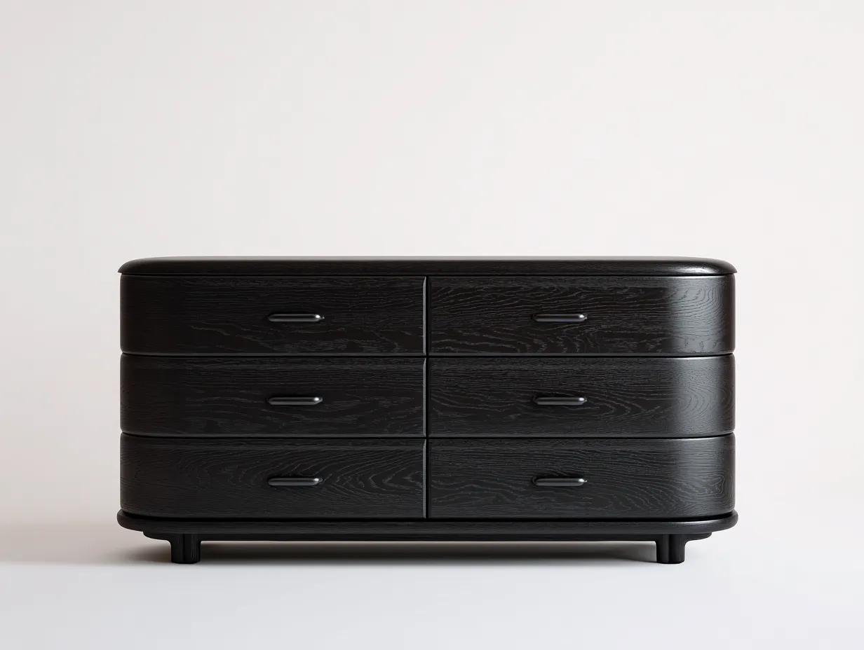 La structure est réalisée en bois avec une finition noire qui révèle subtilement le relief naturel de la surface. Les façades légèrement galbées, les poignées discrètes intégrées et la base robuste participent à une lecture visuelle cohérente et soignée. L ensemble est pensé pour une utilisation régulière dans la chambre, avec une bonne stabilité et une présentation sobre.